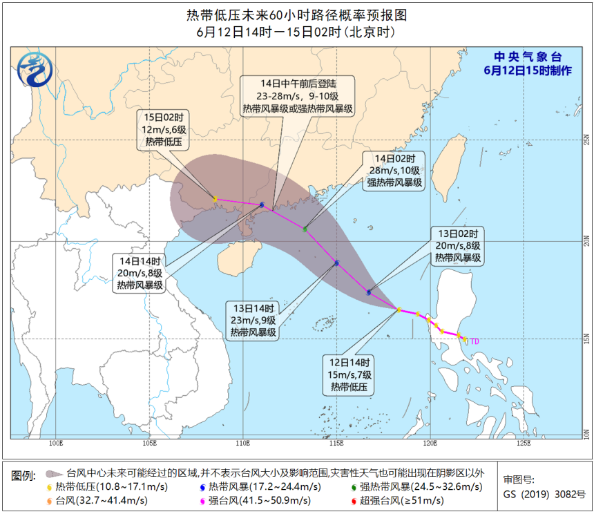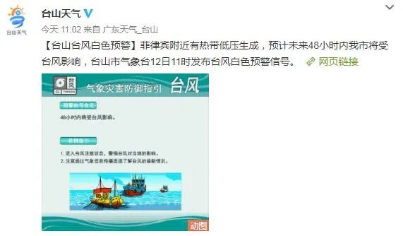 据台山市气象台12日12时发布,原位于菲律宾东部近海的热带扰动已于11日20时加强为热带低压,12日11时其中心位于距离我市沿海东南方约920公里的海面上(北纬16点3度、东经119点3度),中心附近最大风力7级(15米每秒),中心最低气压1000百帕。