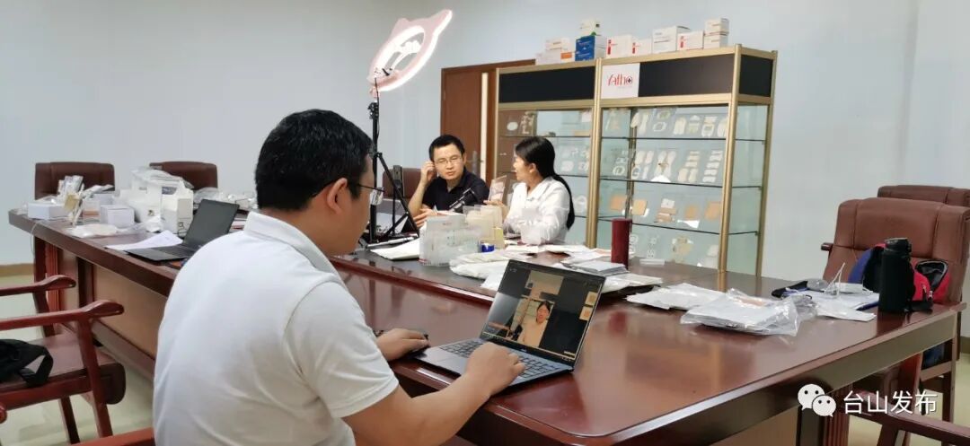 在台山市弘毅医疗用品有限公司直播间,两名销售员正用流利的英语介绍公司产品。该公司是一家主要从事医疗器械和耗材开发、制造、销售的企业。企业负责人王辉介绍,在市科工商务局指导下,前期他们向广交会主办单位上交资料,建立直播间。为照顾世界各地不同时区的客户,他们现在分早中晚三个时期直播,进行远程推介销售。