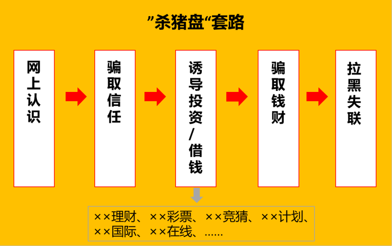 任何一种电信网络诈骗都有常用的话术,只要在网上交友中,遇到了网友跟你说这些话,你可能已经被人当成“小猪仔”了...... 1、我在用手机赚赚外快 这是杀猪盘类诈骗分子引诱受害人上钩的第一步,有意无意透露自己在赚钱,有门道! 2、我这高频彩中奖率特别高 自称有亲戚朋友在网站后台工作,知道系统漏洞,赚钱特别容易,让受害人自以为幸运的遇到了能带他发家致富的知心人! 3、先跟着我玩玩吧,保证你赚钱 让受害人先拿骗子的账号试玩,彻底获取受害人的信任,一旦受害人操作过后就会掉入陷阱,开始自己注册账号充值! 此外,在日常聊天中,还会有意无意跟受害人进行下列对话,进一步获取受害人的信任,对受害人进行洗脑。 4、先借点钱给我,赚了马上还你。 5、请考虑下我们和父母的未来! 6、成为 VIP 就可以赚得更多! 7、贷款很容易,马上就能翻身。 这是所有赌徒都很熟悉的一句话。 利用输钱后急于回本的心理,诱骗受害人不断充钱。 8、我不方便和你视频。 什么人会不方便跟你视频? 只有骗子! 9、我能骗你什么呢。 10、有紧急情况!快把我们的聊天记录全部删除! 销毁证据。 以上都是网络交友诱导投资、赌博诈骗(杀猪盘)骗子最善用的一些话术,大家平时在网络上交友时一定要擦亮双眼。 找你借钱的网友,必须当面核实,如果拒绝视频拒绝电话拒绝见面等一切证明身份的途径,一定是骗子。 自称有各种渠道带你到一些不明网站上投资、赌博下注、购买彩票的,一定是骗子!