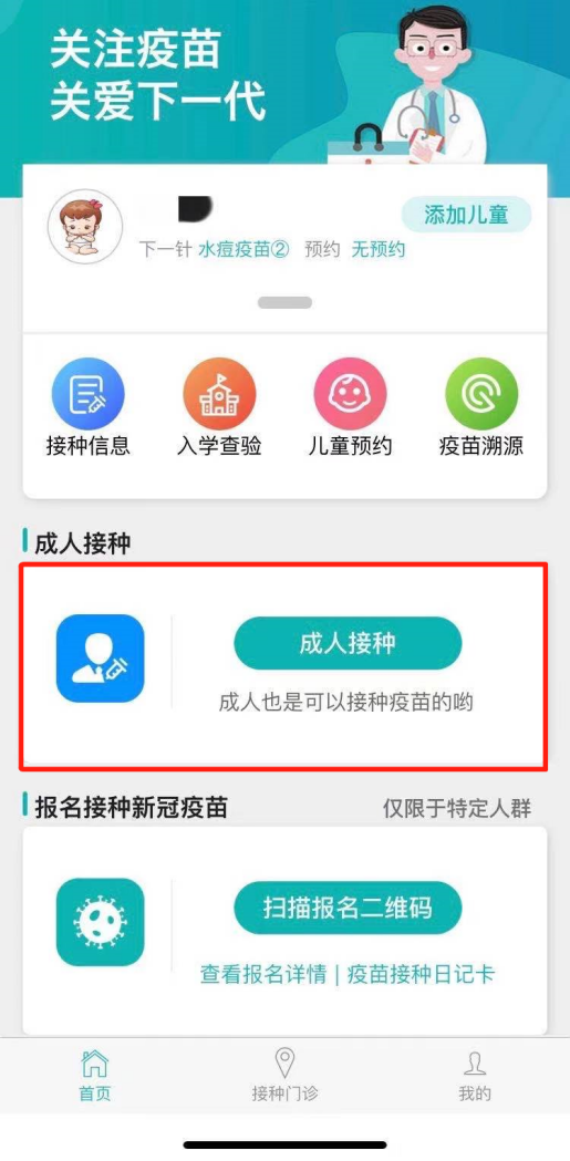 二、如实注册,接种疫苗后点击“成人接种”模块,按要求添加本人。