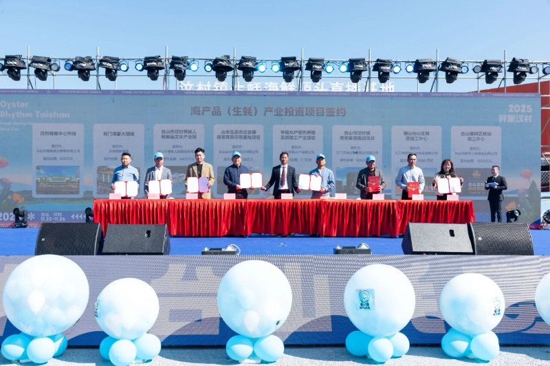 启幕式上,集中签约13个项目,总投资额3.78亿元,项目围绕汶村海产品(生蚝)特色农产品涵盖养殖、深加工、市场建设、餐饮供货及文旅等全产业链。其中,广东华辰水产的1.1亿元现代养殖项目将升级育苗技术,台山养蚝人公司的2000万元蚝制品文化产业园将挖掘渔家文化,贵苑星级酒店项目则为 “蚝旅融合”补上配套短板……