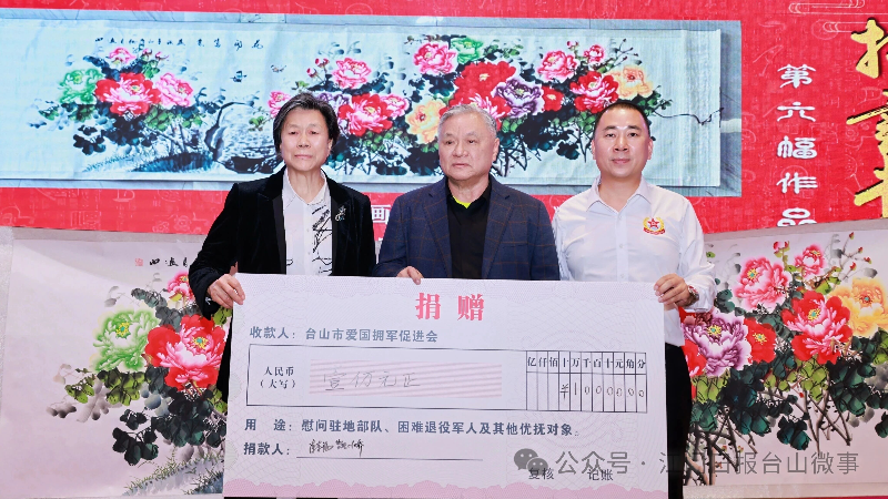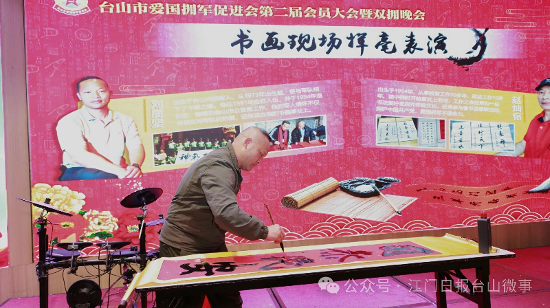 文艺汇演环节紧扣“拥军”主题,彰显军民同心风采。侨都星火江门退役军人志愿服务队带来的合唱《中国军魂》与双人舞《英雄赞歌》,铿锵有力、情感真挚,展现了退役军人昂扬的精神风貌与英雄气概;书画创作环节中,老兵与爱促会会员代表即席挥毫,现场创作“牡丹”、“国泰民安”等作品,以笔墨丹青抒发爱国拥军情怀;由海外书法家、本地艺术家及局领导班子成员捐赠的《山河无恙》《雄风扬正气 热血铸军魂》《宁静致远》等七幅书画作品进行现场义拍,所得善款将全部用于支持促进会开展拥军优属公益活动。
