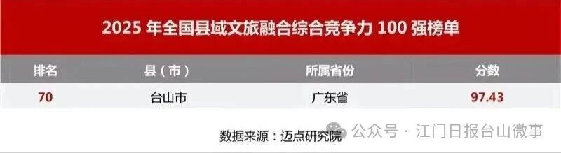 该榜单由迈点研究院联合新华网客户端共同发布,聚焦农文旅资源转化与融合模式创新,旨在发掘县域高质量发展标杆案例。此次入选是对台山文旅融合成效的权威认可,进一步擦亮“中国第一侨乡”品牌,为广东县域文旅发展提供实践经验。