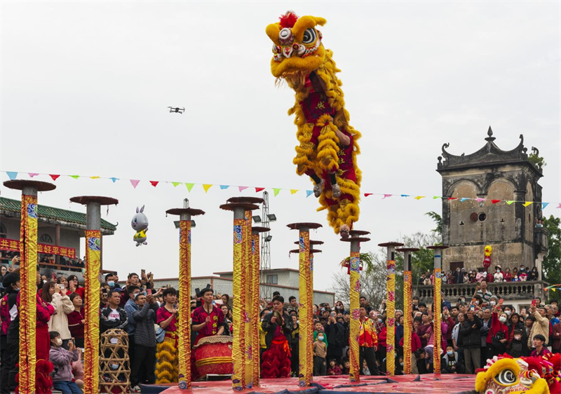 元宵节下午,平洲村闹元宵活动在八台醒狮的助兴中拉开帷幕。狮子随着鼓点的快、慢、轻、重,忽而翘首仰视,忽而回头低顾,忽而回首匍伏,忽而摇头摆尾,一飞一跃尽显风范,观众们为之惊叹。