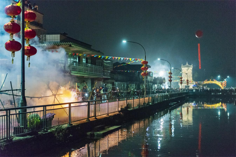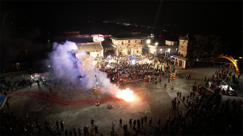 平洲闹元宵其中一个习俗就是烧新丁炮和放烟花。烧新丁炮时村民敲响锣鼓助兴,鞭炮连接成一串长达300多米的鞭炮绕村场摆放,场面非常热烈。元宵节晚上整个平洲村的鞭炮声和烟花持续绽放,场面蔚为壮观,吸引了方圆数十里不少村民和摄影爱好者前来围观,热闹非常。