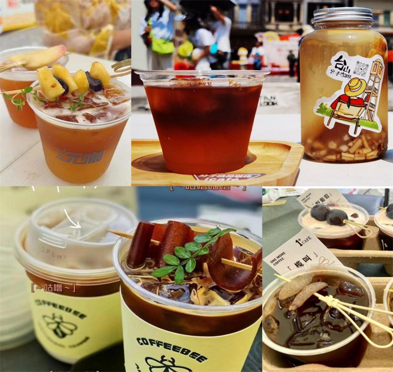 文化集市,台山人气咖啡店各显神通。本次咖啡文化集市聚集了超20个本土品牌及企业,走出常规手冲咖啡、意式咖啡等“舒适圈”,创新推出咖啡与端芬金猪山红茶碰撞特制的限定咖啡,竹蔗茅根冷萃咖啡、梅子汁冰滴咖啡、竹筒咖啡椰子冻等各路特调咖啡争奇斗艳,菠萝、榴莲、野葡萄等当季水果元素纷纷被商家融入咖啡里,玩转新花样。这也成为了本次咖啡文化节点燃“台山咖啡”氛围,消费者络绎不绝、好评不断的关键所在。“这次我们在文化集市上推出了3款自主研发的咖啡饮品,丰富的口感、独特的创意,让初尝咖啡的人也能接受,帮助我们基地打响品牌。”作为土生土长端芬人的参展商家梅明苏表示:“五天来我真是忙个不停,一边冲咖啡一边联系补货,能看见梅家大院重现当年盛景实在是甜在心里。”