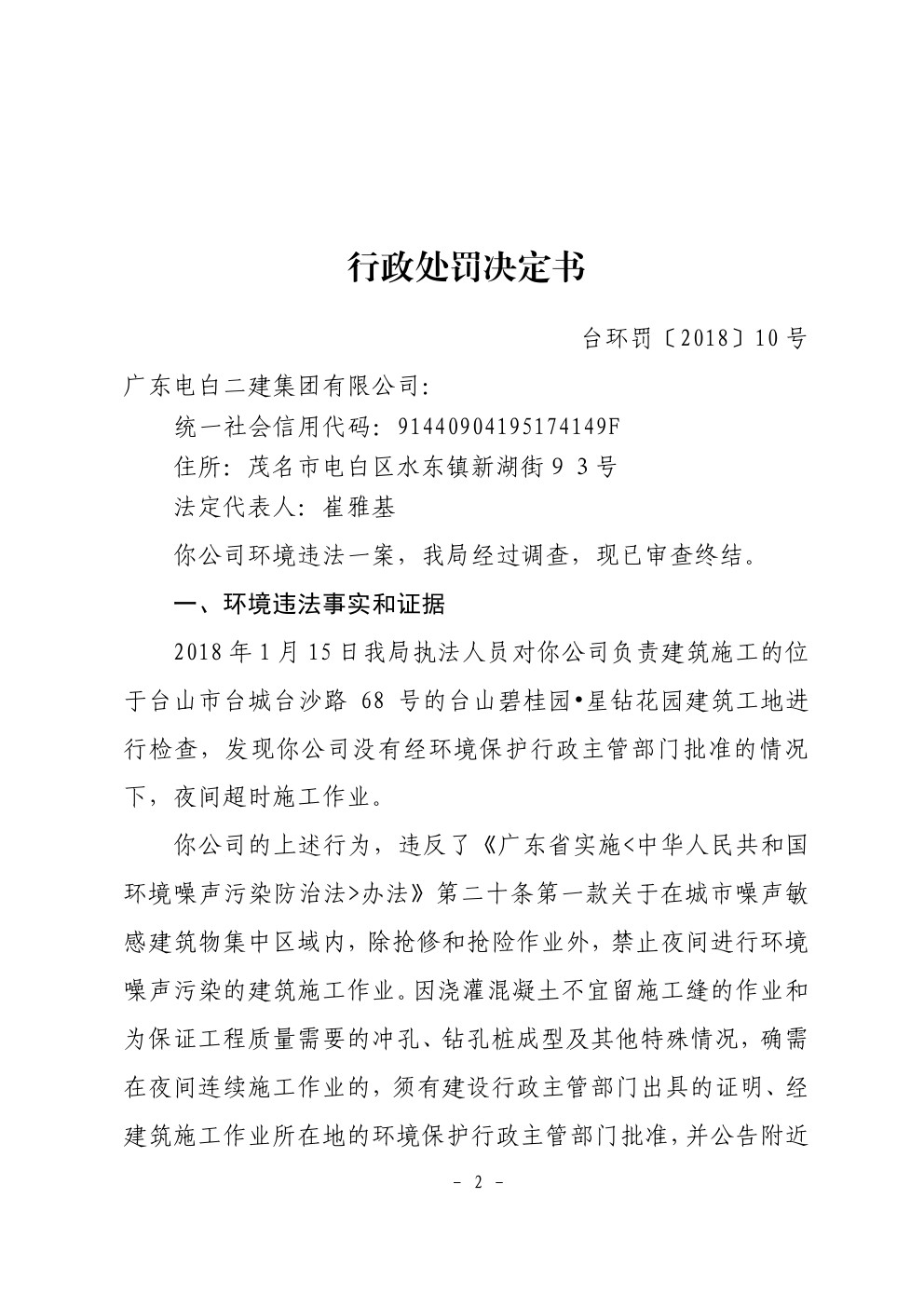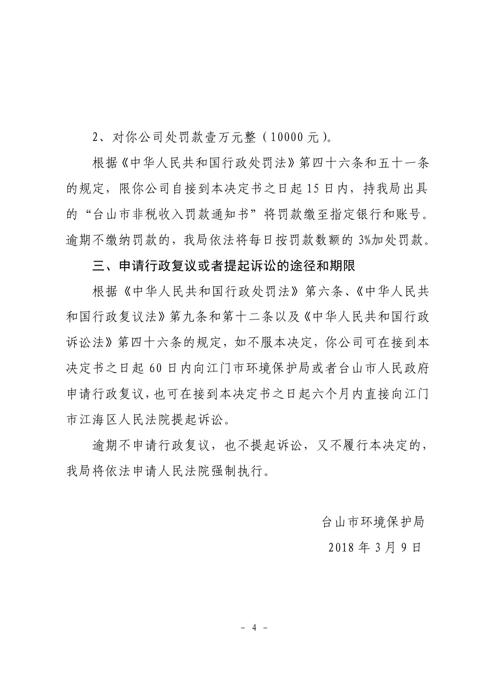 行政处罚决定书(台环罚〔2018〕10号)