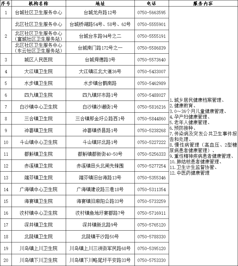 台山市国家基本公共卫生服务机构信息和服务内容公开表