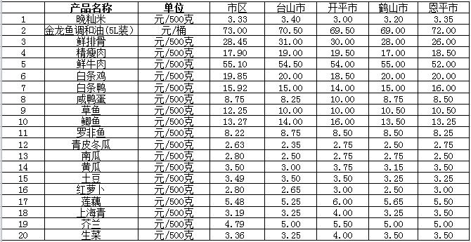 说明:1、表中价格为该地区监测点综合平均价;2、“市区”含蓬江区、江海区、新会区,价格分别采自蓬江市场、江南市场、城东市场等13家农贸市场;3、其他四个县市价格分别采自新华市场、锦江市场等8家农贸市场。