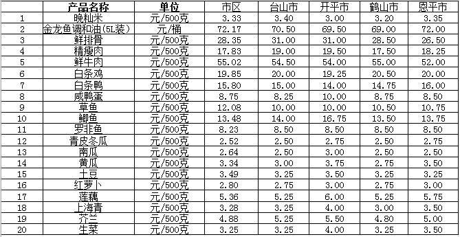 说明:1、表中价格为该地区监测点综合平均价;2、“市区”含蓬江区、江海区、新会区,价格分别采自蓬江市场、江南市场、城东市场等13家农贸市场;3、其他四个县市价格分别采自新华市场、锦江市场等8家农贸市场。