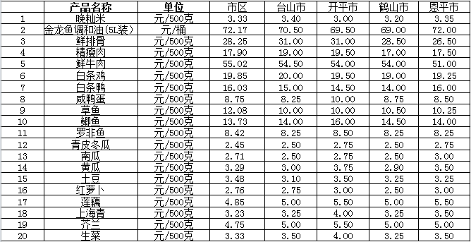 说明:1、表中价格为该地区监测点综合平均价;2、“市区”含蓬江区、江海区、新会区,价格分别采自蓬江市场、江南市场、城东市场等13家农贸市场;3、其他四个县市价格分别采自新华市场、锦江市场等8家农贸市场。