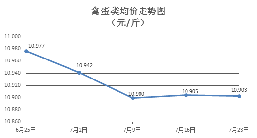 禽蛋类商品价格微幅盘整。上周所监测的6种禽蛋类商品价格波动情况为2涨2跌2平,综合零售均价为10.903元/斤,环比下降0.02%。其中:白条鸡、白条鸭零售均价分别为每斤19.81元、15.36元,环比分别下降0.05%、上涨0.07%;白壳鸡蛋、鸭蛋零售均价分别为每斤6.61元、7.94元,环比分别下降0.75%、持平。