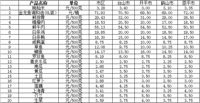 说明:1、表中价格为该地区监测点综合平均价;2、“市区”含蓬江区、江海区、新会区,价格分别采自蓬江市场、江南市场、城东市场等13家农贸市场;3、其他四个县市价格分别采自新华市场、锦江市场等8家农贸市场。