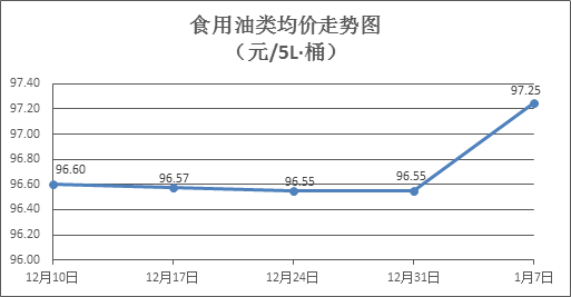 食用油类商品价格微幅盘整。上周所监测的9种食用油(5L装)商品价格波动情况为3涨6跌,综合零售均价为97.25元/桶,环比上涨0.73%。其中:鲁花花生油、玉米油零售均价分别为每桶156.43元、75.32元,环比分别下降0.45%、上涨0.76%。