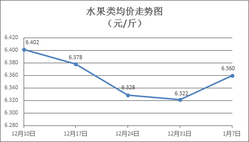 水果类商品价格总体略涨。上周所监测的6种水果商品价格波动情况为5涨1跌,综合零售均价为6.360元/斤,环比上涨0.61%。其中橙子、葡萄、梨零售均价分别为每斤5.41元、13.29元、6.04元,环比分别下降3.57%、上涨1.22%、上涨1.51%。
