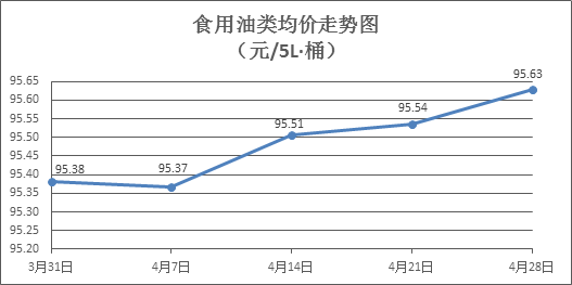 食用油类价格总体微涨。所监测的9种食用油(5L装)商品价格波动情况为5涨2跌2平,综合零售均价为每桶95.63元,环比上涨0.10%。其中:鲁花花生油、金龙油调和油零售均价分别为每桶154.13元、71.64元,环比分别下降0.08%、上涨0.13%。
