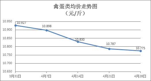 禽蛋类商品价格微幅下降。所监测的6种禽蛋类商品价格波动情况为4跌2平,综合零售均价为每斤10.775元,环比下降0.11%。其中:白条鸡、白条鸭零售均价分别为每斤19.96元、14.81元,环比分别持平、下降0.13%;白壳鸡蛋、鸭蛋零售均价分别为每斤6.32元、7.48元,环比分别下降0.47%、持平。
