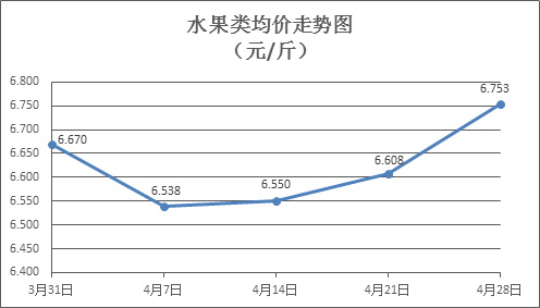 水果类商品价格有所上涨。所监测的6种水果商品价格波动情况为3涨3跌,综合零售均价为每斤6.753元,环比上涨2.19%。其中橙子、苹果、葡萄零售均价分别为每斤5.54元、7.39元、15.30元,环比分别上涨1.65%、持平、上涨4.72%。