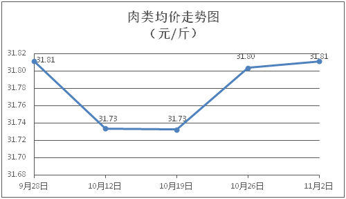 肉类商品价格窄幅盘整。所监测的8种肉类商品价格波动情况为3涨5跌,综合零售均价为每斤31.81元,环比上涨0.02%。其中:排骨、精瘦肉、牛肉、带骨羊肉零售均价分别为每斤30.18元、18.43元、46.84元、40.55元,环比分别下降0.26%、上涨0.05%、下降0.49%、上涨1.65%。