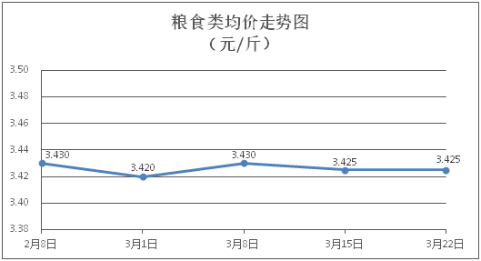 粮食类商品价格保持稳定。所监测的粮食类商品价格均持平,综合零售均价为每斤3.425元。其中:丝苗米、面粉零售均价分别为每斤3.56元、3.43元,环比均持平。