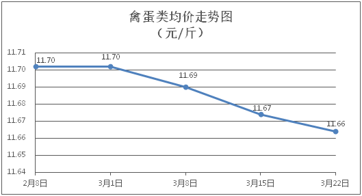 禽蛋类商品价格窄幅盘整。所监测的禽蛋类商品价格波动情况为2涨3跌,综合零售均价为每斤11.66元,环比下降0.09%。其中:白条鸡、白条鸭零售均价分别为每斤21.17元、15.19元,环比分别下降0.14%、下降0.33%;鸡蛋、咸鸭蛋零售均价分别为每斤6.24元、8.73元,环比分别上涨0.48%、下降0.23%。