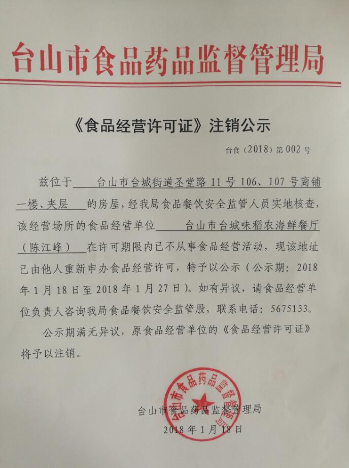 台山市台城味稻农海鲜餐厅《食品经营许可证》注销公示