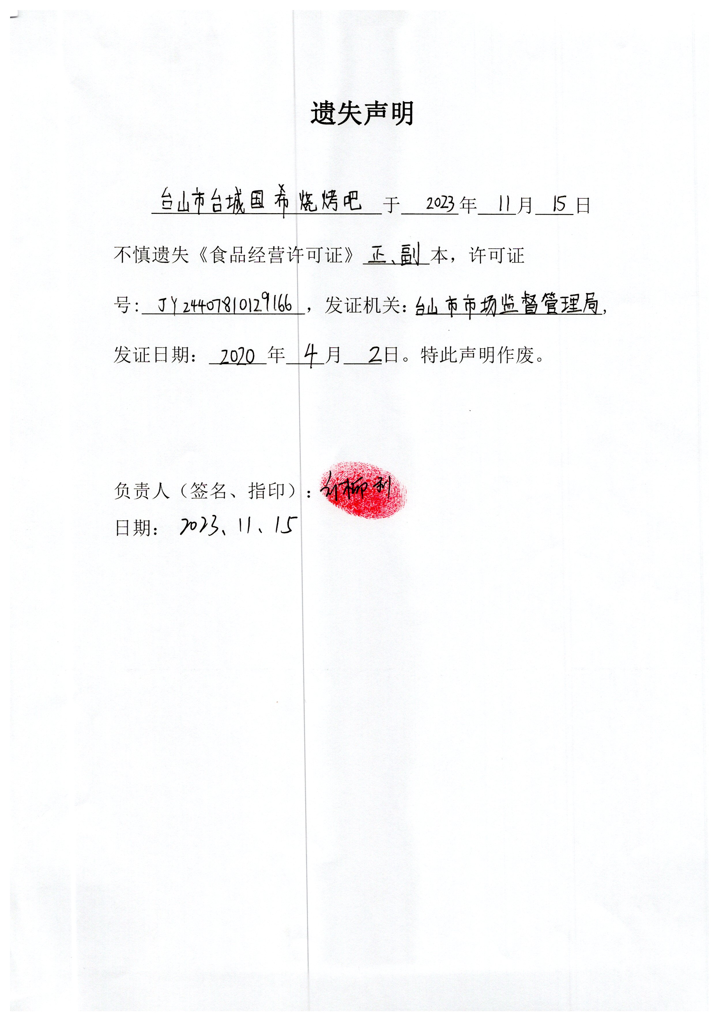 遗失声明——台山市台城国希烧烤吧