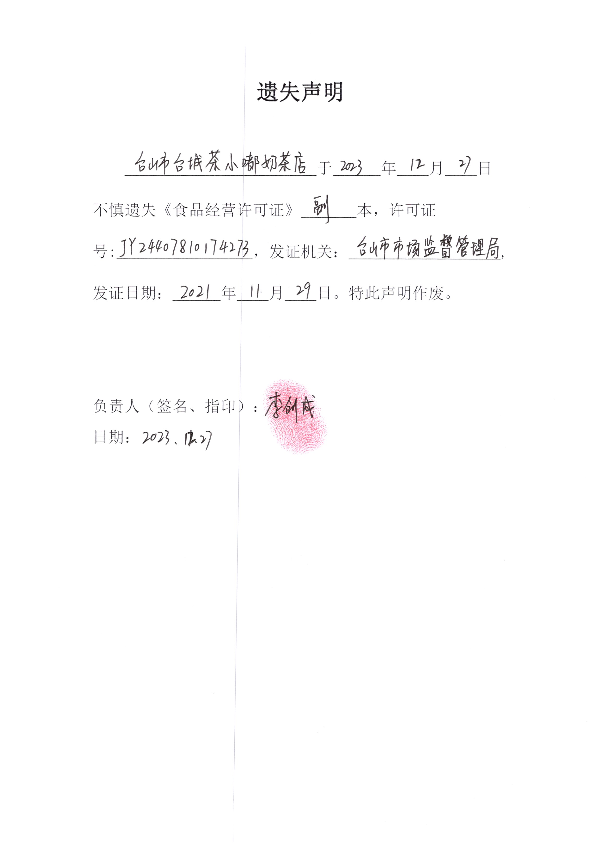 遗失声明——台山市台城茶小嘟奶茶店