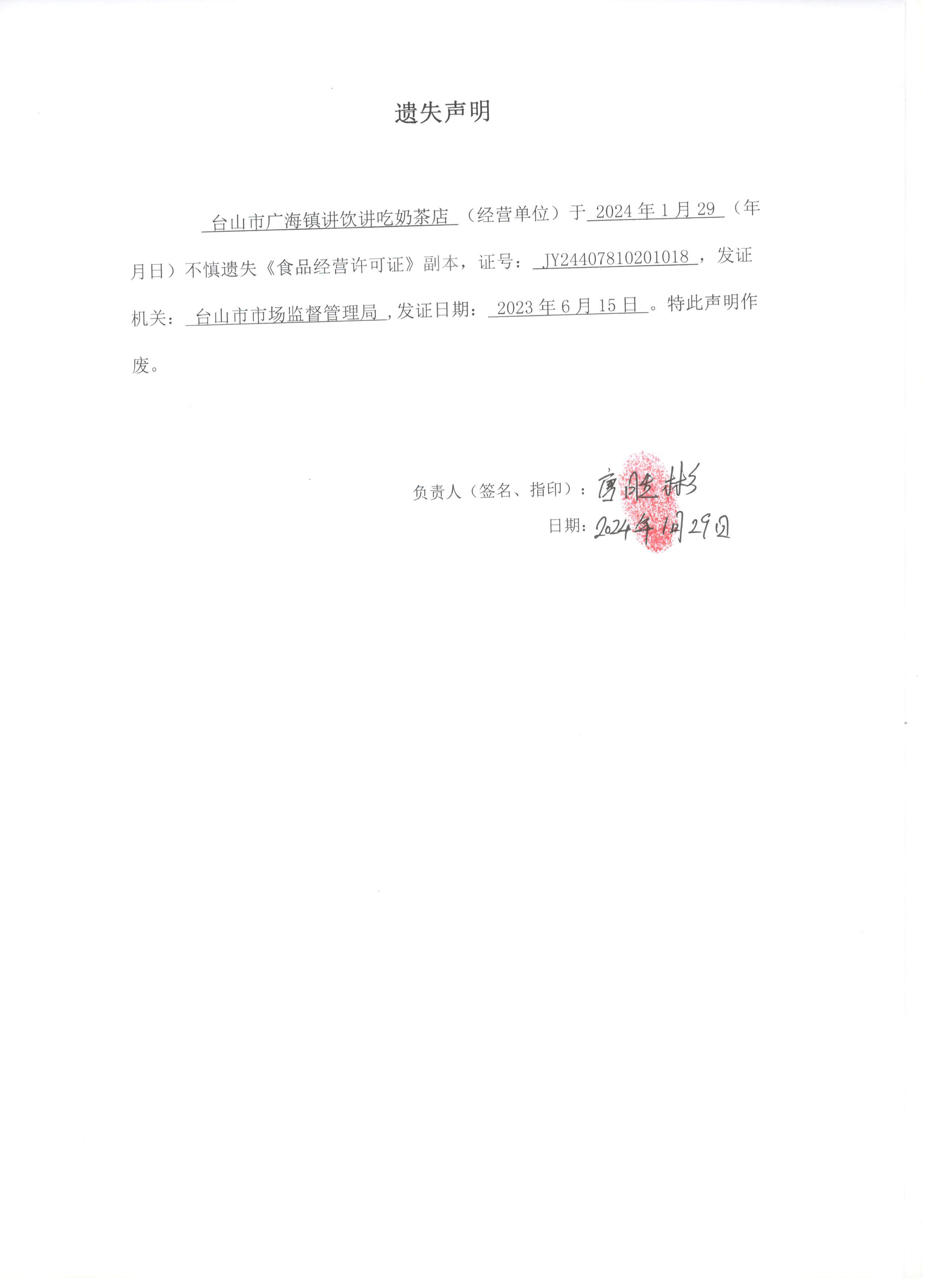 遗失声明——台山市广海镇讲饮讲吃奶茶店