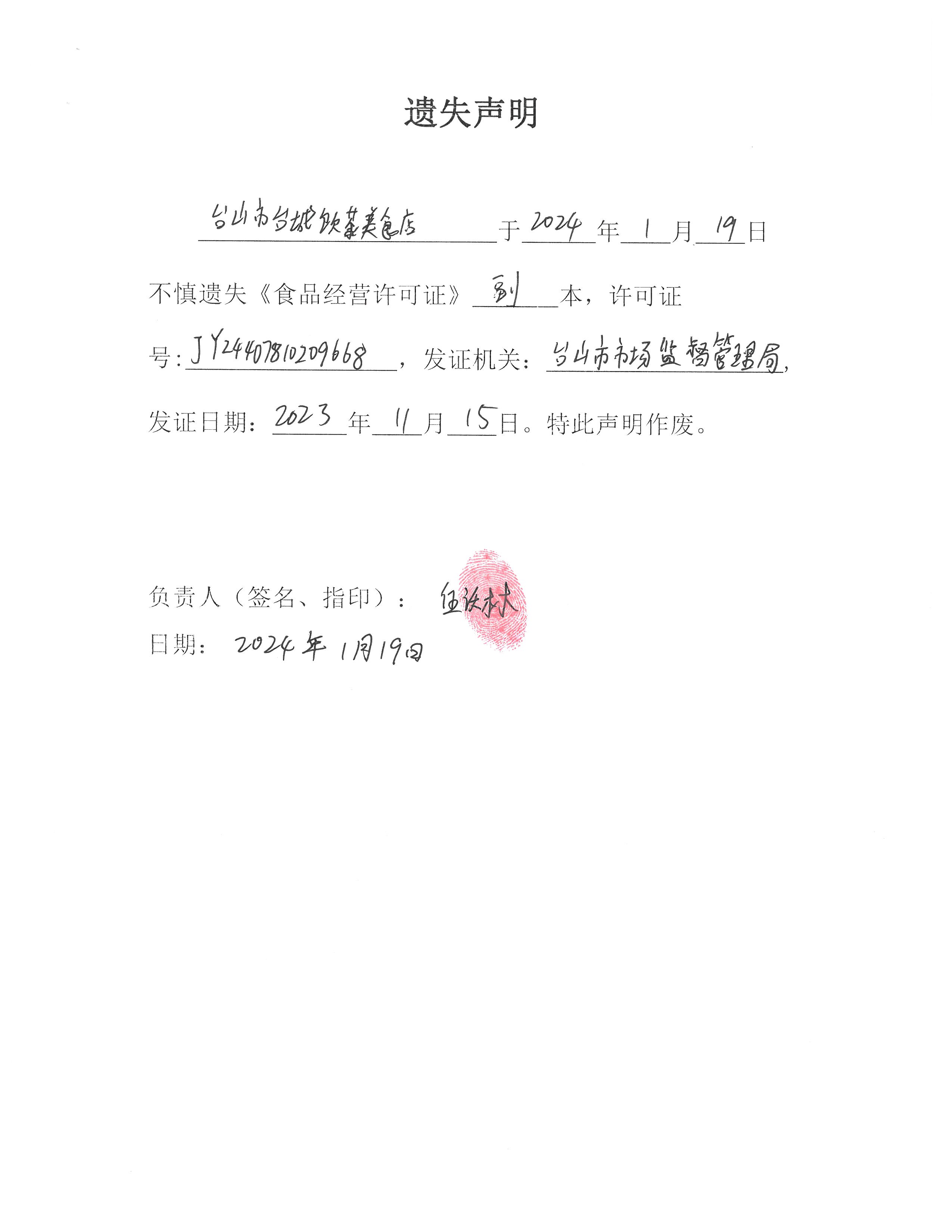 遗失声明——台山市台城饮茶美食店