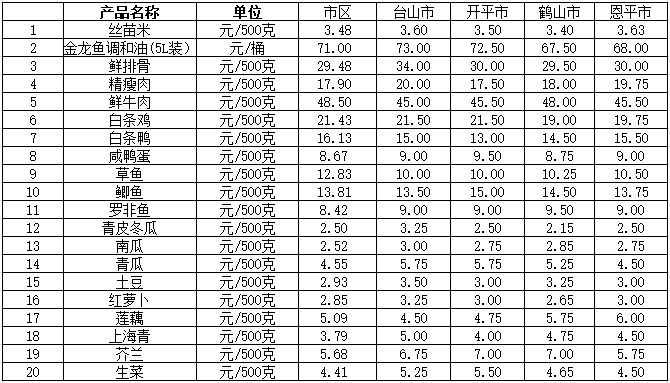 说明:1、表中价格为该地区监测点综合平均价;2、“市区”含蓬江区、江海区、新会区,价格分别采自蓬江市场、江南市场、城东市场等13家农贸市场;3、其他四个县市价格分别采自新华市场、锦江市场等8家农贸市场。