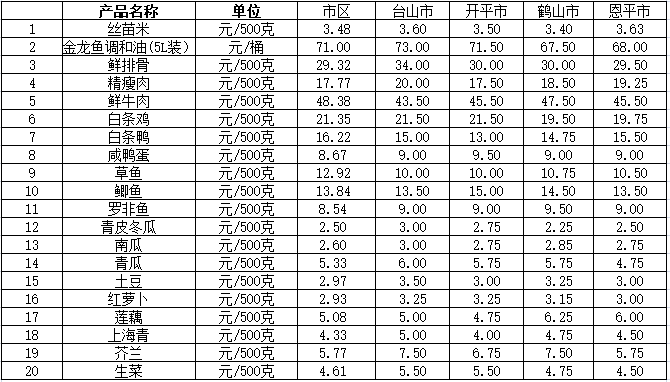 说明:1、表中价格为该地区监测点综合平均价;2、“市区”含蓬江区、江海区、新会区,价格分别采自蓬江市场、江南市场、城东市场等13家农贸市场;3、其他四个县市价格分别采自新华市场、锦江市场等8家农贸市场。