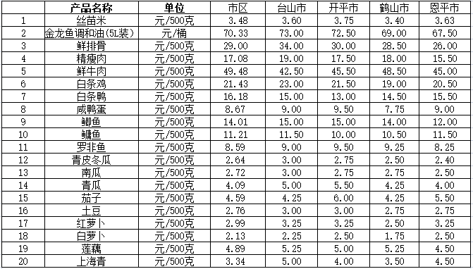 说明:1、表中价格为该地区监测点综合平均价;2、“市区”含蓬江区、江海区、新会区,价格分别采自蓬江市场、江南市场、城东市场等13家农贸市场;3、其他四个县市价格分别采自新华市场、锦江市场等8家农贸市场。