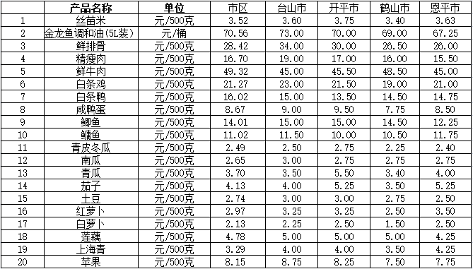 说明:1、表中价格为该地区监测点综合平均价;2、“市区”含蓬江区、江海区、新会区,价格分别采自蓬江市场、江南市场、城东市场等13家农贸市场;3、其他四个县市价格分别采自新华市场、锦江市场等8家农贸市场。