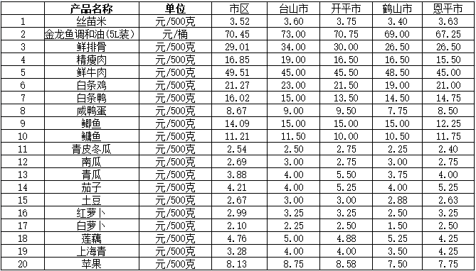 说明:1、表中价格为该地区监测点上周综合平均价;2、“市区”含蓬江区、江海区、新会区,价格分别采自蓬江市场、江南市场、城东市场等13家农贸市场;3、其他四个县市价格分别采自新华市场、锦江市场等8家农贸市场。