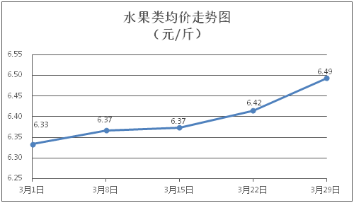 水果类商品价格有所上涨。所监测的水果商品价格波动情况为4涨2平,综合零售均价为每斤6.49元,环比上涨1.22%。其中苹果、香蕉、葡萄零售均价分别为每斤8.14元、3.03元、13.90元,环比分别上涨0.25%、上涨0.33%、上涨2.96%。