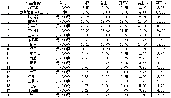 说明:1、表中价格为该地区监测点综合平均价;2、“市区”含蓬江区、江海区、新会区,价格分别采自蓬江市场、江南市场、城东市场等13家农贸市场;3、其他四个县市价格分别采自新华市场、锦江市场等8家农贸市场。