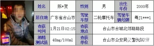 1月21日凌晨2时许,一辆粤J1***1号二轮摩托车在台城北郊路路段被交警大队专业队民警依法截停检查。民警对该车驾驶人进行酒精呼气测试,结果为48mg/100ml,属于饮酒后驾驶机动车违法。此外,民警在检查中发现,该驾驶人陈某(男,18岁,广东台山人)的驾驶证是2018年8月初次领取的,仍处于实习期。根据相关法律法规,陈某将被处以罚款2000元,驾驶证记12分的处罚;因其在实习期内记满12分,将被注销其实习的准驾车型驾驶资格。