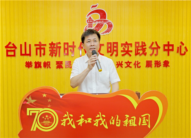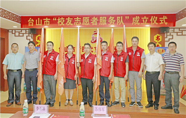 成立仪式上,教育局党组书记、局长李石凑和国家税务总局台山市税务局副局长苏伟军、总会计师陈卓孟、主任科员刘宏忠为台山一中、台山侨中、更开中学、培英职校、任远中学、台城二小的校友志愿者服务队授旗。