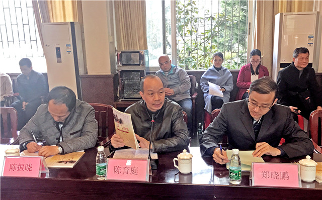 陈育庭一行听取了我市关于《江门历史》的推广、开课、教学情况以及教师任教心得体会等汇报后,充分肯定了我市各校重视开设《江门历史》课程,并且因地制宜地结合乡土历史文化,创造性地利用本土资源、形式多样地上好《江门历史》,培养了学生热爱家乡的真挚情感,唤起了学生学习江门历史、传承江门传统文化的浓厚兴趣,在中学教学实践中很好地弘扬了江门历史文化,达到了编撰《江门历史》的初衷。