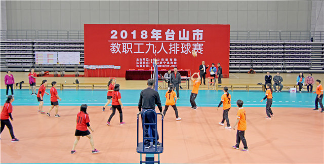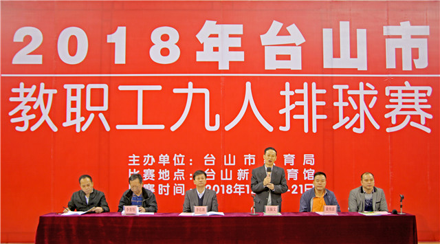 12月19日,2018年台山市教职工九人排球比赛在新宁体育馆拉开帷幕。教育局党组书记、局长李石凑,副局长吴振文、李育恒,党组成员黄伟湛等参加了开幕式,吴振文致开幕词,李石凑宣布排球赛开赛。