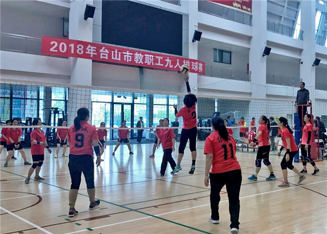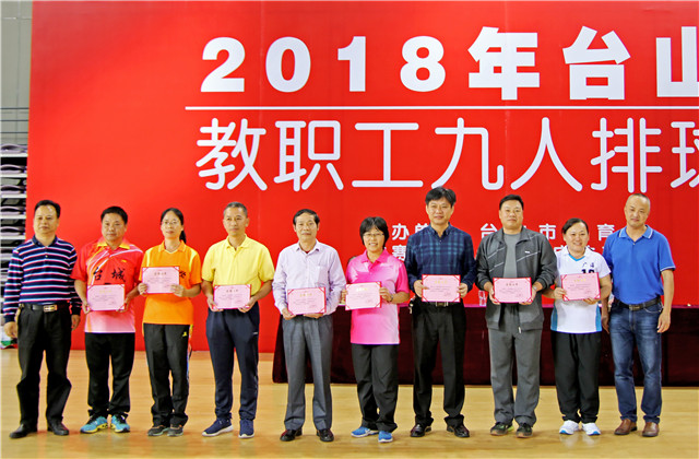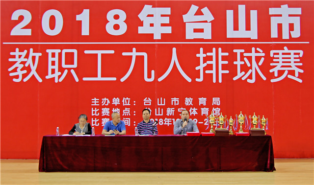 12月21日,2018年台山市教职工九人排球赛在新宁体育馆落下帷幕,教育局党组成员容惠汉出席颁奖仪式。