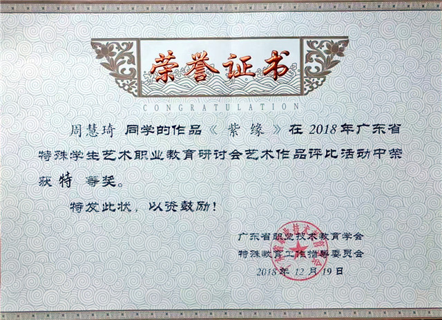热烈祝贺我市特殊教育学校在2018年广东省特殊学生艺术职业教育研讨会艺术作品评比活动中荣获优秀组织奖;廖玲、陈惠仪老师荣获“优秀指导教师”荣誉称号;学生周慧琦的三幅作品分别荣获特等奖、二等奖和三等奖,林雯慧、刘文科的作品荣获一等奖,黄逸成的两幅作品分别获得一等奖和三等奖,陈仲根的作品荣获二等奖,林朝闯的两幅作品分别获奖二等奖和三等奖,蔡家豪、黎培宏、黎振东、马盈的作品荣获三等奖。