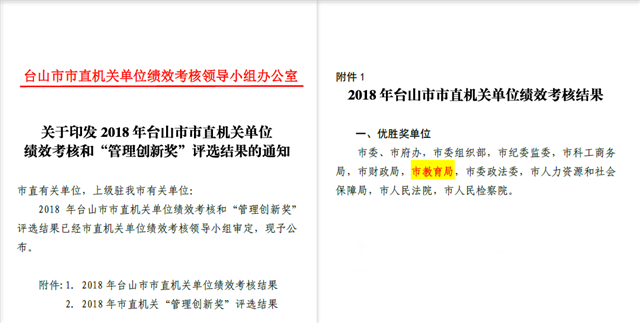 近日,2018年市直机关单位绩效考核结果出炉。教育局被评为优秀,并在22个优秀单位比拼中再脱颖而出,荣获“优胜奖”,成绩在社会管理类中居头名。至此,教育局在2016、2017、2018三年市绩效考核中获三连“优”,其中2017和2018年荣获“优胜奖”。