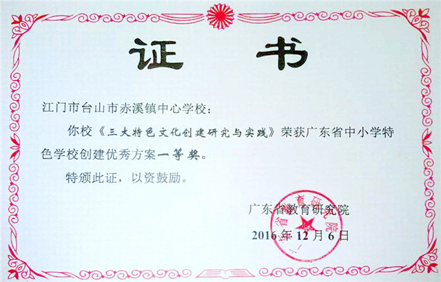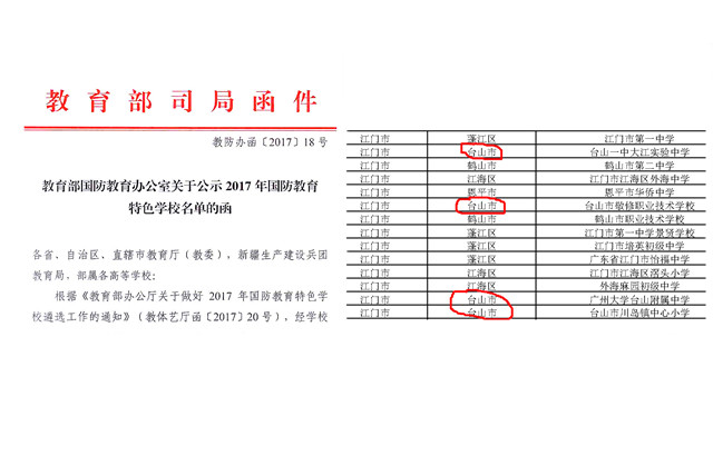 广州大学台山附属中学、大江实验中学、敬修职业技术学校、川岛镇中心小学被教育部认定为“国防教育特色学校”,台山侨中、培正中学和广海中学被教育部认定为“全国青少年校园足球特色学校”,广海镇中心小学被评为全国中小学中华优秀文化艺术传承学校,育才学校、台城城东小学、赤溪镇中心学校、更开中学被评为广东省“书香校园”,赤溪镇中心学校获“广东省中小学特色学校创建”优秀方案评选一等奖。
