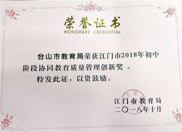台城二小《点之碟碟》和广海镇中心小学《打龙船》2个节目亮相中央电视台。学校体育健儿历史性地包揽2018年江门市中小学生田径锦标赛高中、初中和小学团体冠军。培英职校周伟瑜、伍活明和陈艺峰三位学生开发的“危险区域的闯入预警系统”获国家知识产权局授予专利权。新宁中学陈培伟、张雨柔获第五届广东省青少年科技创新实践能力挑战赛一等奖。台城二小方蔼滢、李钰怡和谭立扬共同设计的多方位高处清理器获第33届省青少年科技创新大赛二等奖。
