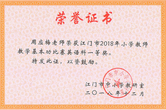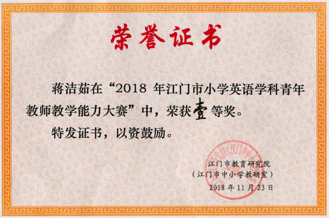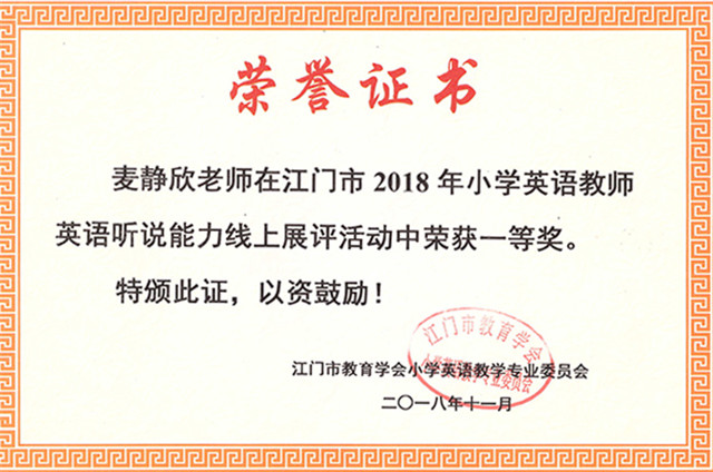 2018年,我市小学英语取得了多方面的喜人成绩:成功举办初中小学英语教学工作衔接研讨会;与中山市小榄镇合作开展“核心素养之英语阅读教学”集中研讨活动;台城一小及冲蒌镇中心小学英语科组参加江门市小学先进教研组展示交流活动;108人在江门市小学英语教师听说能力展评活动中获奖;109人在江门市小学英语青年教师基本功大赛(笔试)中获奖;城北小学蒋洁茹和培正小学周应梅两位教师参加江门市青年教师教学能力大赛分别获一等奖和二等奖等等。