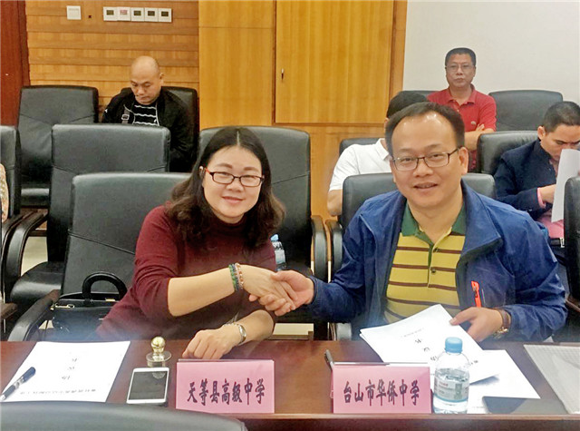 广东选择33所优质普通高中,与广西33个贫困县的33所普通高中结成“一帮一”对子学校,其中江门市5所,台山仅1所。台山侨中副校长黄国盼代表学校与天等县高级中学签订结对帮扶协议书。签约仪式结束后,双方就安排支教、跟岗学习等事宜进行了对接。