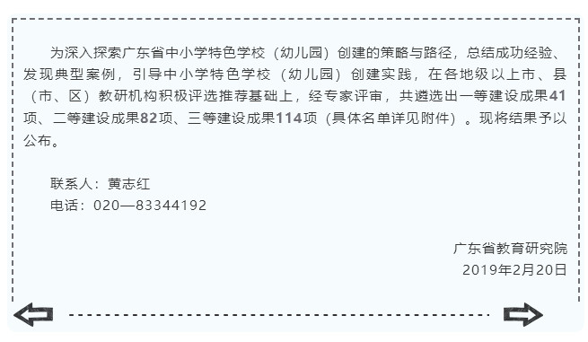 广东省教育研究院近日公布“广东省第二届中小学特色学校(幼儿园)建设成果”征集活动遴选结果,共237项入围。我市5所学校上榜,其中台山侨中的建设成果为一等,武溪中学的为二等,培正小学、广海镇中心小学和台城二小的均为三等。