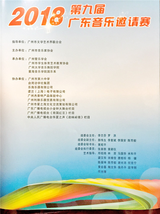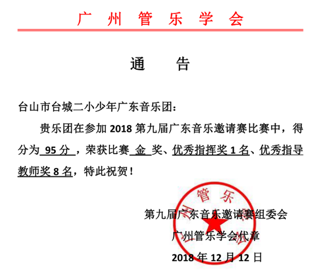 12月8—9日,2018年第九届广东音乐邀请赛在广州市第六中学举行。台城二小民乐团在100个参赛团队(其中小学组29个)中脱颖而出,获得金奖。李剑昌老师获优秀指挥奖,王景芳等8人被评为“优秀指导教师”。